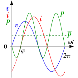 As will be shown next, using current and voltage as phasors, if both phases advance in time with the same angular frequency , the first term is a constant while the second term oscillates at an angular frequency of .
