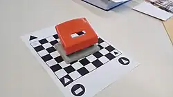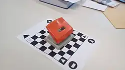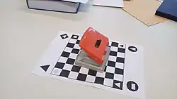 - (Small Objects) For smaller objects place a structured surface under your object you want to scan (e.g. chess grid with unique markers at the edges). It helps Regard3D to identify spatial locations of points and the mathing between the set of images (see demo on the right with a chess board like surface the has unique markers on the edges to support identification of 3D geometry). The surface can be removed after the calculation of the 3D model within Regard3D.
