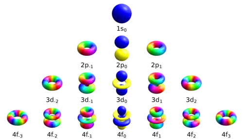 ![]() The first property describing the orbital is the w:principal quantum number, n, which is the same as in Bohr's model. n denotes the energy level of each orbital. The possible values for n are integers: The next quantum number, the w:azimuthal quantum number, denoted l, describes the shape of the orbital. The shape is a consequence of the w:angular momentum of the orbital. The angular momentum represents the resistance of a spinning object to speeding up or slowing down under the influence of external force. The azimuthal quantum number represents the orbital angular momentum of an electron around its nucleus. The possible values for l are integers from 0 to n − 1 (where n is the principal quantum number of the electron): The shape of each orbital is usually referred to by a letter, rather than by its azimuthal quantum number. The first shape (l=0) is denoted by the letter s (a w:mnemonic being "sphere"). The next shape is denoted by the letter p and has the form of a dumbbell. The other orbitals have more complicated shapes (see w:atomic orbital), and are denoted by the letters d, f, g, etc. The third quantum number, the w:magnetic quantum number, describes the w:magnetic moment of the electron, and is denoted by ml (or simply m). The possible values for ml are integers from −l to l (where l is the azimuthal quantum number of the electron): The magnetic quantum number measures the component of the angular momentum in a particular direction. The choice of direction is arbitrary, conventionally the z-direction is chosen. The fourth quantum number, the w:spin quantum number (pertaining to the "orientation" of the electron's spin) is denoted ms, with values +1⁄2 or −1⁄2. The chemist w:Linus Pauling wrote, by way of example: