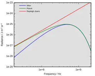 In the late 19th century, a number of formulae had been created that could somewhat describe some of the experimental measurements of thermal radiation: how the wavelength at which the radiation is strongest changes with temperature is given by w:Wien's displacement law, the overall power emitted per unit area is given by the Stefan-Boltzmann law. The best theoretical explanation of the experimental results was the Rayleigh-Jeans law, which agrees with experimental results well at large wavelengths (or, equivalently, low frequencies), but strongly disagrees at short wavelengths (or high frequencies). In fact, at short wavelengths, classical physics predicted that energy will be emitted by a hot body at an infinite rate. This result, which is clearly wrong, is known as the w:ultraviolet catastrophe. However, classical physics led to the Rayleigh-Jeans law, which, as shown in the figure, agrees with experimental results well at low frequencies, but strongly disagrees at high frequencies. Physicists searched for a single theory that explained all the experimental results.