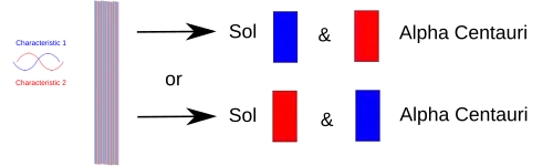 It is the underlying structure and symmetry of atomic orbitals, and the way that electrons fill them, that leads to the organisation of the w:periodic table. The way the atomic orbitals on different atoms combine to form w:molecular orbitals determines the structure and strength of chemical bonds between atoms. --> Quantum entanglementWikipedia![]() The Pauli exclusion principle says that two electrons in one system cannot be in the same state. Nature leaves open the possibility, however, that two electrons can have both states "superimposed" over each of them. Recall that the wave functions that emerge simultaneously from the double slits arrive at the detection screen in a state of superposition. Nothing is certain until the superimposed waveforms "collapse". At that instant an electron shows up somewhere in accordance with the probability that is the square of the absolute value of the sum of the complex-valued amplitudes of the two superimposed waveforms. The situation there is already very abstract. A concrete way of thinking about entangled photons, photons in which two contrary states are superimposed on each of them in the same event, is as follows: Imagine that the superposition of a state labeled blue, and another state labeled red then appear (in imagination) as a purple state. Two photons are produced as the result of the same atomic event. Perhaps they are produced by the excitation of a crystal that characteristically absorbs a photon of a certain frequency and emits two photons of half the original frequency. So the two photons come out purple. If the experimenter now performs some experiment that determines whether one of the photons is either blue or red, then that experiment changes the photon involved from one having a superposition of blue and red characteristics to a photon that has only one of those characteristics. The problem that Einstein had with such an imagined situation was that if one of these photons had been kept bouncing between mirrors in a laboratory on earth, and the other one had traveled halfway to the nearest star, when its twin was made to reveal itself as either blue or red, that meant that the distant photon now had to lose its purple status too. So whenever it might be investigated after its twin had been measured, it would necessarily show up in the opposite state to whatever its twin had revealed. In trying to show that quantum mechanics was not a complete theory, Einstein started with the theory's prediction that two or more particles that have interacted in the past can appear strongly correlated when their various properties are later measured. He sought to explain this seeming interaction in a classical way, through their common past, and preferably not by some "spooky action at a distance." The argument is worked out in a famous paper, Einstein, Podolsky, and Rosen (1935; abbreviated EPR), setting out what is now called the w:EPR paradox. Assuming what is now usually called w:local realism, EPR attempted to show from quantum theory that a particle has both position and momentum simultaneously, while according to the w:Copenhagen interpretation, only one of those two properties actually exists and only at the moment that it is being measured. EPR concluded that quantum theory is incomplete in that it refuses to consider physical properties that objectively exist in nature. (Einstein, Podolsky, & Rosen 1935 is currently Einstein's most cited publication in physics journals.) In the same year, w:Erwin Schrödinger used the word "entanglement" and declared: "I would not call that one but rather the characteristic trait of quantum mechanics." The question of whether entanglement is a real condition is still in dispute. The w:Bell inequalities are the most powerful challenge to Einstein's claims. My way![]() ![]()