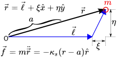 Figure 1. A mass is attached to a spring of length . The mass has been displaced from its equilibrium point by direction and by direction. Both and are assumed small for a wave in the linear regime. The vector represents the distance between consecutive lumped masses when the wave amplitude is zero. It is assumed that because the string is under tension, and is the length of the relaxed spring of spring constant . In expressing Newton's second law, the acceleration is written as using the convention that a dot denotes differentiation with respect to time.