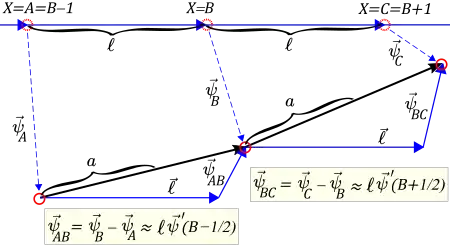Here we adopt the convention that  unit of length. We label masses with the variable that represents each mass by an integer . To obtain a wave equation we focus on the three consecutive integers, . When the string is at equilibrium (i.e., zero wave amplitude), we can also use non-integral values of to form a coordinate system that labels points in space between the masses, as shown in the top of Figure 2.