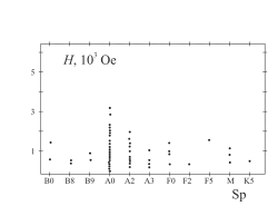 All the known stars can be divided into two great classes – non-magnetic and magnetic. This division is to some extent conventional, since non-magnetic stars have small total dipole magnetic field, but in some points of the surface they can have significant local magnetic fields. Magnetic stars have dependence between the angular momentum of proper rotation and the total magnetic moment, and we can observe the change of sign and overturn of the dipole magnetic moment like on the Sun. Magnetic stars usually rotate 2 – 4 times more slowly than non-magnetic, and their matter composition has excess of elements of the type of iron and rare-earth elements.