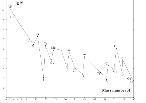 The actual distribution of stars is shown in Figure 1, and it can be compared with the distribution of chemical elements. There are two main distributions of chemical elements: the first – for meteorites and the Earth's crust, and the second – for the Sun, planetary nebulae and stars. It turns out that there is close similarity between the distribution of the abundance of stars in the Galaxy, and the distribution of chemical elements in the Sun and stars in Figure 2. The similarity of both distributions is also stressed by the fact that in the range of mass numbers from 35 to 55 in both figures there is a dip, after which in Figure 2 the so-called iron peak begins. The figures show that in the Universe the low-mass chemical elements dominate and the stars corresponding to them.