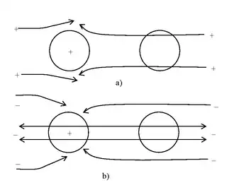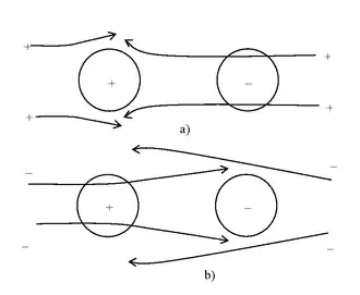 Fig.2. The lines of motion of small particles of vacuum which are a) positively charged, b) negatively charged, near two bodies, one of which is negatively charged and the other is positively charged.