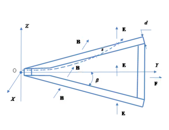 Fig.1. A spacecraft engine using energy of electrogravitational vacuum. The figure shows a section of the engine's working chamber in the form of a truncated cone. The quantity is the thickness of the cone walls, the angle denotes the cone opening angle, the electric field is directed along the OZ axis, the magnetic field is directed against the OX axis, the thrust force accelerates the engine along the OY axis of coordinate system. The dashed line shows trajectory of a positively charged vacuum particle, specifies the length of the particle's path in the cone wall.