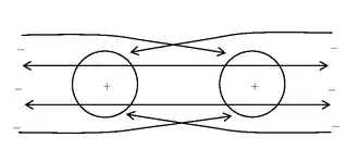 Fig.3. The lines of motion of small particles of vacuum, which are negatively charged, near two positively charged bodies.