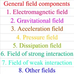 | Field function | Electromagnetic field | Gravitational field | Acceleration field | Pressure field | Dissipation field | Strong interaction field | Weak interaction field | General field |