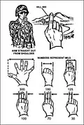 A Preliminary Investigation established that the outstretched hand method is approximately correct. There is evidence that the use of the little finger to measure 1° overestimates the actual angle by about 1/3 of a degree. It was also noted that the hand position used to measure 20° was uncomfortable and might perhaps be replaced by a measurement with the three fingers "up", as shown in figure to the right (except with the thumb and little finger held as far apart as is comfortably possible)
