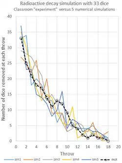 To know if the random error is consistent with the laws of probability for such a decay process, we use matlab codes. These codes simulate any number of labs for an arbitrary number of dice.