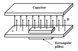 Typically, charge is located within the pillobx. If the pillbox is taken from an isolated plain of charge, the fields point in opposite directions, with , so that,