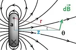 An element of the magnetic field due to an element of current is shown in the figure above and to the right. Here, points downward because the element at the top of the loop was chosen. We seek only the component, so we multiply by the cosine of the acute angle in the right triangle shown: , where