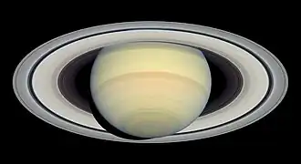 The rings of Saturn are the most extensive ring system of any planet in the Solar System. They consist of countless small particles, ranging in size from micrometers to meters,[3] that orbit about Saturn. The ring particles are made almost entirely of water ice, with a trace component of rocky material. There is still no consensus as to their mechanism of formation. Although theoretical models indicated that the rings were likely to have formed early in the Solar System's history,[4] new data from Cassini suggest they formed relatively late.[5]