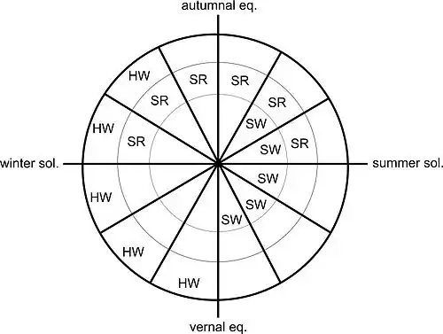 Scheme of appropriate type of stem cuttings according to season, based on several sources. Key: eq.:equinox, sol.: solstice, HW: hardwood, SR: semi-ripe, SW: softwood.