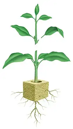 • Stem cuttings, in which a piece of stem is part buried in the soil, including at least one leaf node. The cutting is able to produce new roots, usually at the node.