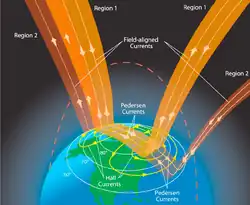 The schematic at right describes the Birkeland or field-aligned currents and the ionospheric current systems they connect to.[10]