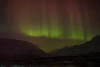 {{free media}}An aurora occurring as bands can have several bands in close proximity following a similar path as with the bands in the right image.