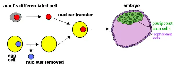 In order to create pluripotent stem cells for patients that will not be immunologically rejected, nuclear transfer has been extensively studied. As shown in Figure 2, nuclei can be removed from differentiated cells of a patient and injected into oocytes. The cytoplasm of oocytes contains proteins that can reprogram nuclear DNA to an embryonic stem cell state.