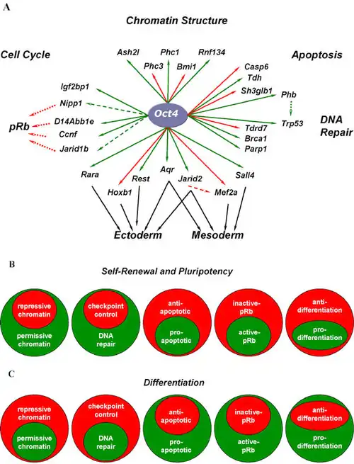 - ↑ 8.0 8.1 8.2 Oct4 Targets Regulatory Nodes to Modulate Stem Cell Function by Pearl A. Campbell, Carolina Perez-Iratxeta, Miguel A. Andrade-Navarro and Michael A. Rudnicki in PLoS ONE (2007) 2(6): e553.