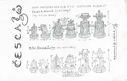 Make large-size outdoor chesspieces out of segments of tree-trunk (up to 9"-diameter checkers which serve as the pedestal), with the bark still on it to serve as the black pieces; or blocks of milled, sanded dimension-lumber and plywood (white pieces). The ČESCAGO system shown in the adjoining diagram uses size, shape and arms which stick out at various places to distinguish the different pieces.