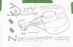 • B. "Milled lumber two-track Bogie" (see "Zooky" illustration, below) -- flat bar of hardwood lumber, preferably warped, with angled notches along two of its long edges, one having a notch every inch (slow kratztrack) and the other a notch every centimeter (fast kratztrack). Take care to sand away every possible splinter (see Sanding Systems, below). Sand "with the grain" on the notched side and "across the grain" on the unnotched side (so that the crossgrain sanding produces microscopic grooves which make surprising tones when this side of the Bogie is kratzed lengthwise across a sharp edge such as the lip of a cat-food can, bottle-bottom or tape-reinforced cardboard box).
