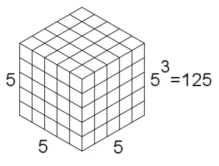 Similarly, a convenient way to say that a number is to be multiplied by itself and then itself again (for example 5×5×5) is to say that the number is cubed. To help visualize this, picture a cube which is 5 units long, 5 units wide, and 5 units high. This cube will then have a volume of 53 or 125 cubic units. 53 can be read "five to the third power" but is commonly read "five cubed."