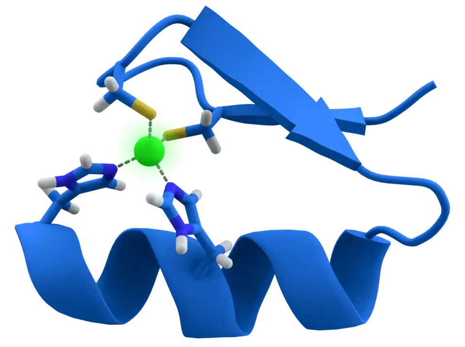 C | Cys | The sulfur atom bonds readily to heavy metal ions. Under oxidizing conditions, two cysteines can join together in a disulfide bond to form the amino acid cystine. When cystines are part of a protein, insulin for example, the tertiary structure is stabilized, which makes the protein more resistant to denaturation; therefore, disulfide bonds are common in proteins that have to function in harsh environments including digestive enzymes (e.g., pepsin and chymotrypsin) and structural proteins (e.g., keratin). Disulfides are also found in peptides too small to hold a stable shape on their own (eg. insulin). |