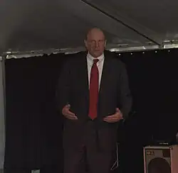 Example: In this photo the man is describing a camera lens verbally, while simultaneously representing the size and shape of the lens with his hand. |
