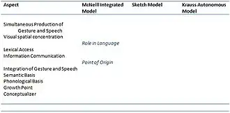 The Krauss model differs from the previous ones in that it sees gesture and speech as non-integrated; in this way, gestures may serve to communicate some meaning, but their primary role is to facilitate lexical retrieval. [10] So this model focuses on the ‘lexical access’ role of gestures while the McNeill and Sketch models focus on the ‘information communication’ role.