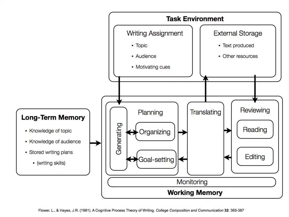 - ↑ Hayes, J. R., and Flower, L. S. (1987). On the Structure of the Writing Process. Top Lang Disord, 7(4), 19-30. USA: Aspen Publishers.