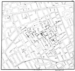 Snow later used a dot map to illustrate the cluster of cholera cases around the pump. He also used statistics to illustrate the connection between the quality of the water source and cholera cases. He showed that the Southwark and Vauxhall Waterworks Company was taking water from sewage-polluted sections of the Thames and delivering the water to homes, leading to an increased incidence of cholera. Snow's study was a major event in the history of public health and geography. It is regarded as the founding event of the science of epidemiology.[64][65]
