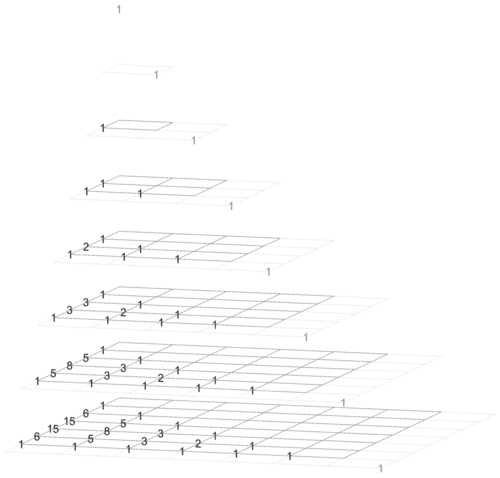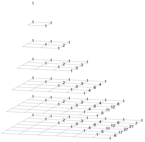Only positive coordinates are shown. The column with d = v = 0 is hidden. StackedLime(a, 0, 0) = 1. DiagonalLime(0, 0, 0) = 1.