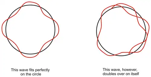 The meaning of allowed orbits can be discerned from the pair of figures situated to the left. The wavelength must be such that the number that fit into a full circumference (2пr) must equal one, or two, or 3, or 4 (and so forth). In one case, the wave fits perfectly in the circles (with exactly four wavelengths). This corresponds to an electron in the third excited state, or n =4. The other wave does not fit into its allowed radius because it doubles over itself. This energy level does not exist for this atom.