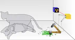 | “ | One can even set up quite ridiculous cases. A cat is penned up in a steel chamber, along with the following device (which must be secured against direct interference by the cat): in a Geiger counter, there is a tiny bit of radioactive substance, so small, that perhaps in the course of the hour one of the atoms decays, but also, with equal probability, perhaps none; if it happens, the counter tube discharges and through a relay releases a hammer that shatters a small flask of hydrocyanic acid. If one has left this entire system to itself for an hour, one would say that the cat still lives if meanwhile no atom has decayed. The psi-function of the entire system would express this by having in it the living and dead cat (pardon the expression) mixed or smeared out in equal parts.. | ” |