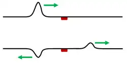 The image to the left illustrates a simple argument for a probabilistic interpretation. Although the wave shown is not a solution to Schrodinger's equation. Wavepackets can become delocalized, hear by impinging on some sort of barrier. What attribute of a particle can be in two places at the same time? Probability! To create this situation in a classroom, tape a wooden block to a stretched snaky spring and strike it.