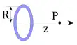 3) A ring is uniformly charged with a net charge of 5 nC. The radius of the ring is R=1.9 m, with its center at the origin and oriented normal to the z axis as shown. what is the magnitude of the electric field at a distance z=1.3 m (on axis) away from the loop's center?
