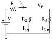 3) In the circuit shown V=16.2 V, R1=2.84 Ω, R2=7.06 Ω, and R3=13.1 Ω. What is the power dissipated by R2?