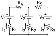 2) The resistances in the figure shown are R1= 1.33 Ω, R2= 1.72 Ω, and R2= 3.69 Ω. V1 and V3 are text 0.606 V and 3.31 V, respectively. But V2 is opposite to that shown in the figure, or, equivalently, V2=−0.608 V. What is the absolute value of the current through R1?