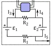 3) Two sources of emf ε1=24.8 V, and ε2=10.3 V are oriented as shownin the circuit. The resistances are R1=2.19 kΩ and R2=1.6 kΩ. Three other currents enter and exit or exit from portions of the circuit that lie outside the dotted rectangle and are not shown. I3=2.49 mA and I4=0.83 mA enter and leave near R2, while the current I5 exits near R1.What is the magnitude (absolute value) of I5?