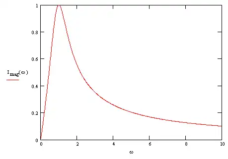 The change from a series arrangement to a parallel arrangement has some very real consequences for the behaviour. This can be seen by plotting the magnitude of the current . For comparison with the earlier graph we choose values where R = 1 ohm, C = 1 farad, L = 1 henry, and V = 1.0 volt and ω in radians per second: