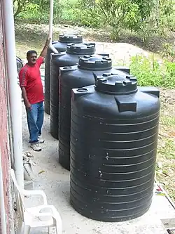 Rooftop rainwater harvesting is the act of collecting, diverting and storing water from rain events for later reuse. A rainwater harvesting systems utilize building infrastructure surfaces, such as roofs, paving materials and exterior walls to divert atmospheric water and store the water in underground or above-ground tanks for later use. These systems require a cohesive design process in order to ensure that water can be supplied of the appropriate quantity and quality as anticipated. One way to collect water is rooftop rainwater harvesting, where any suitable roof surface — tiles, metal sheets, plastics, but not grass or palm leaf — can be used to intercept the flow of rainwater in combination with gutters and downpipes (made from wood, bamboo, galvanized iron, or PVC) to provide a household with stored water, that along with appropriate filtration and/or disinfection, can be used for potable and non-potable end-uses. A rooftop rainwater harvesting system might be a 500 cubic meter underground storage tank, serving a whole community, or it might be just a bucket, standing underneath a roof without a gutter. Rainwater harvesting systems have been used since antiquity, and examples abound in all the great civilizations throughout history.