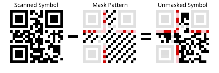 A masking process is used to avoid features in the symbol that might confuse a scanner, such as misleading shapes that look like the locator patterns and large blank areas. Masking inverts certain modules (white becomes black and black becomes white) while leaving others alone.