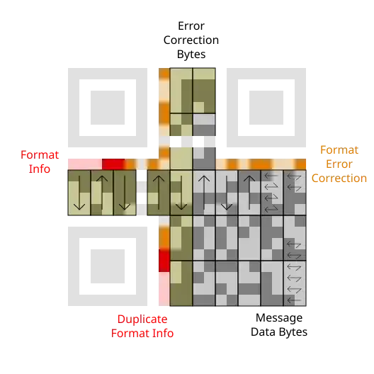 There are two identical copies of the formatting information, so that the symbol can still be decoded even if it is damaged. The second copy is broken in two pieces and placed around the other two locators, and is read in a clockwise direction (upwards in the lower-left corner, then left-to-right in the upper-right corner).