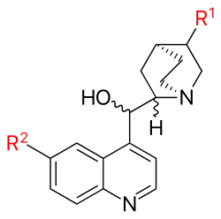 - quinine and quinidine]] (stereoisomers with R1 = vinyl, R2 = methoxy)