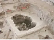 Building 3, a 400-square-foot mud-brick structure, was probably home to several generations of a Neolithic family. Excavations revealed painted walls, a flint dagger with a carved bone handle, the remains of a collapsed roof and the residue of woven baskets, a domed clay oven, and burials of both children and adults beneath the floor.