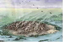 In Turkish, the word Çatalhöyük (say “cha-tal-HU-yuk”) means “forked mound,” referring to a footpath that once split between the east and west mounds that make up the 70-foot-high remains of the settlement today. In Neolithic times, the two mounds straddled a river, long gone today, which could provide fresh water and food for the village, including fish and the eggs of water fowl. At the time, the environment was a semiarid plain, dominated by low-growing grasses, sedges, and small bushes. In the spring, the area would have been surrounded by wetlands, offering mud and reeds as building materials.