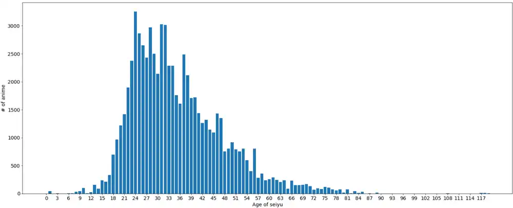 The histogram displays age in years along its X-axis and the total number of roles dubbed by seiyu of this age along the Y-axis.