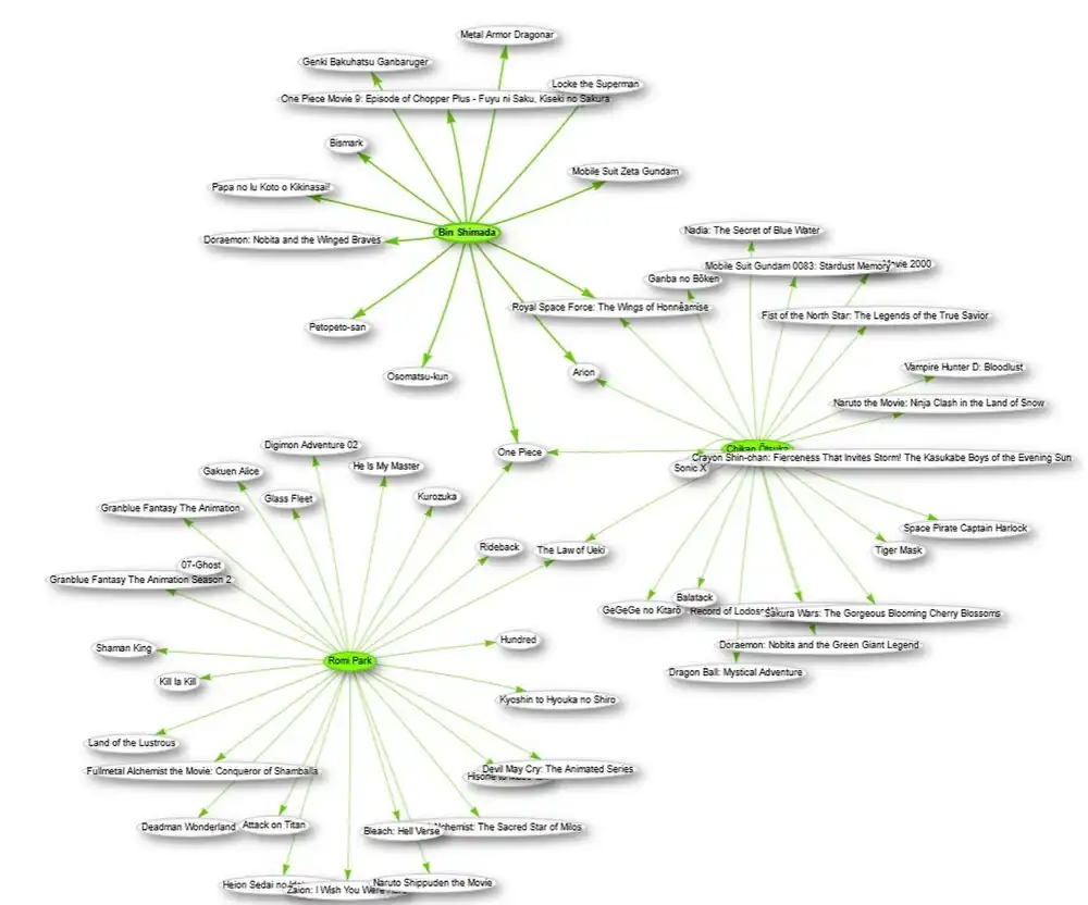 Most of the seiyu give voice to multiple characters from different anime. Let us create a directed graph that connects seiyu to anime they have voiced using the following query.