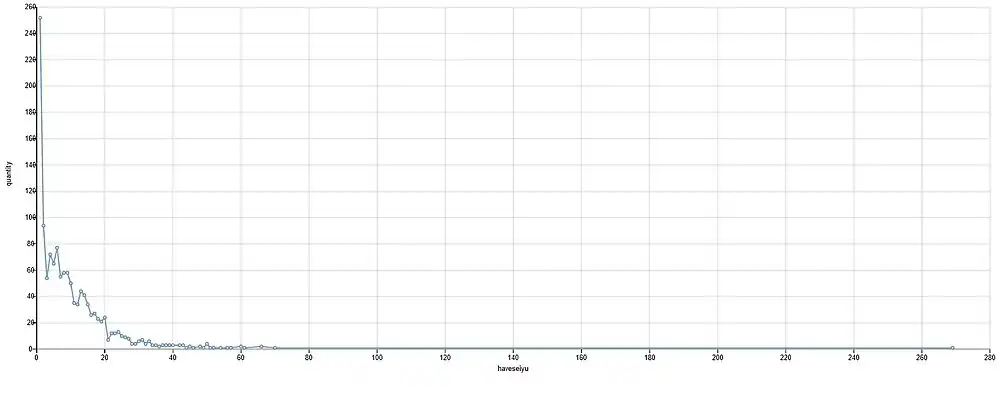 Figure 2 shows that the higher the number of voiced anime is, the lower the number of seiyu who attain so many roles. Line 4 of query above sets the limit at 71 anime as there are only a few seiyu who have worked on a larger number of anime, and expanding the line chart farther to the right would not be informative.